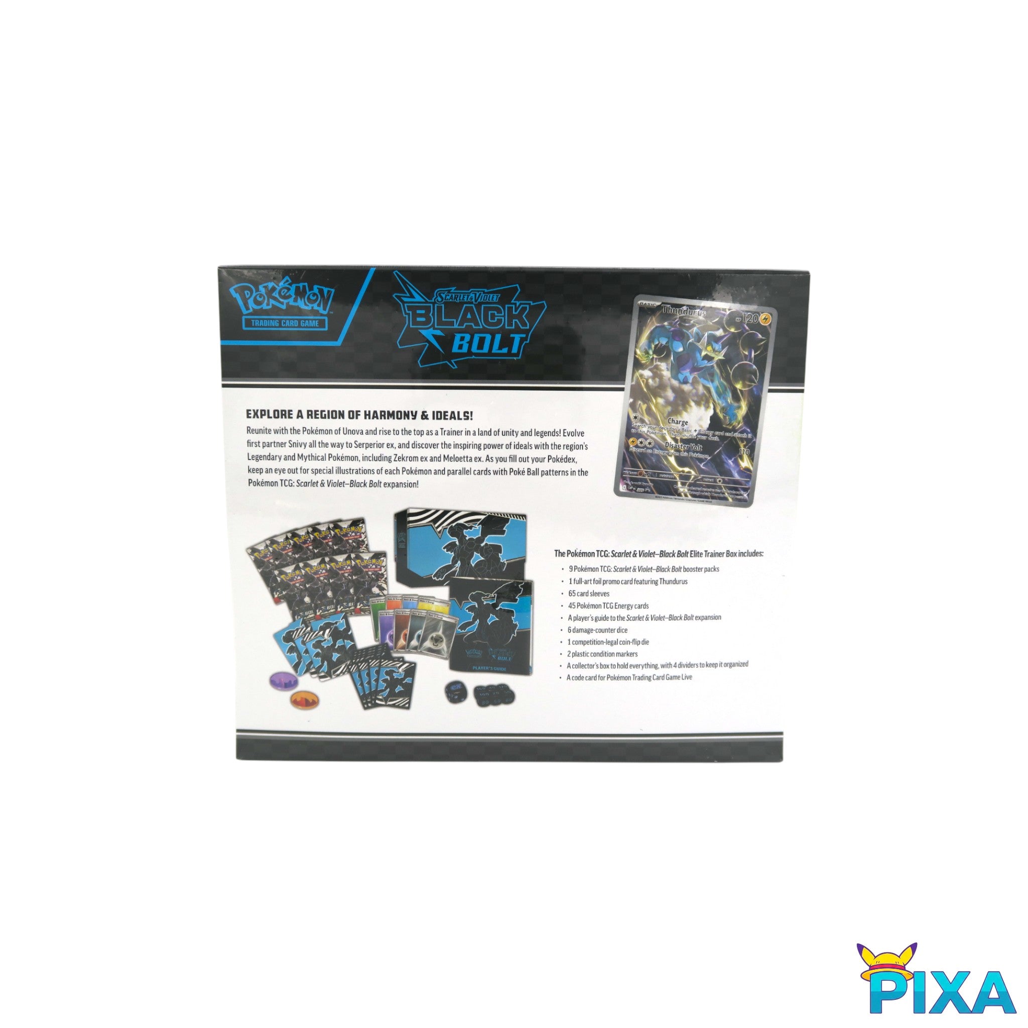 Return to the Unova region and discover the inspiring power of Legendary Pokémon with the Scarlet & Violet—Black Bolt expansion! This Elite Trainer Box is your gateway to a land of unity and legends, featuring Pokémon originally discovered in Unova, including the mighty Zekrom and a special promo card of Thundurus.